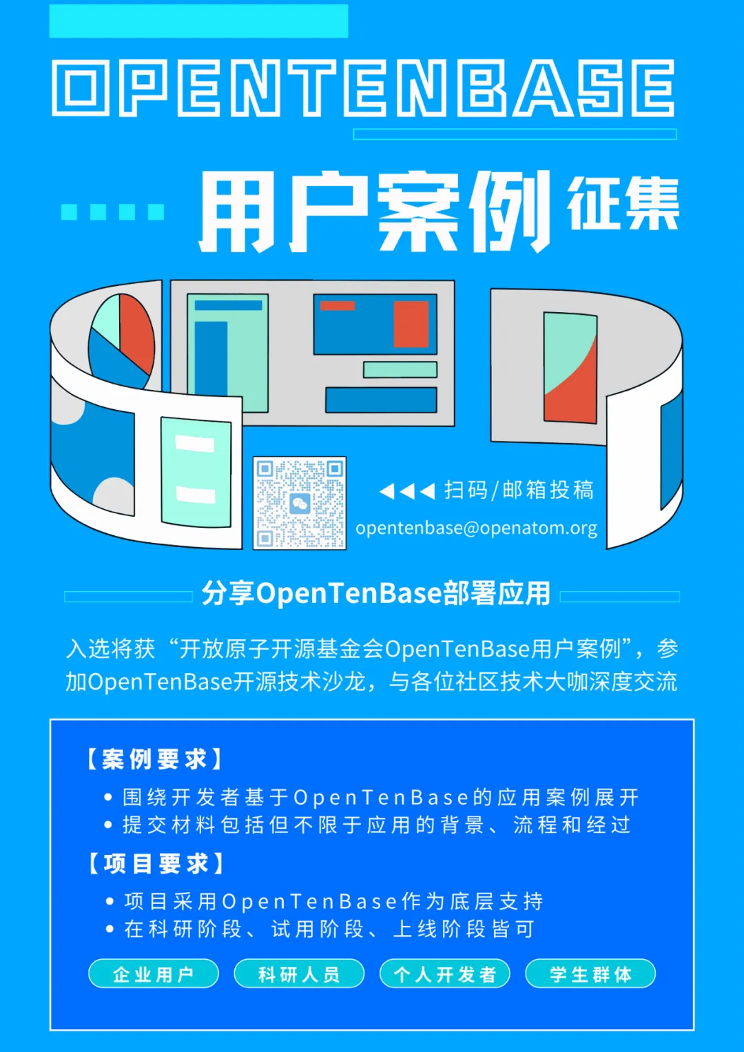 面向人群:企业用户、科研人员、个人开发者、学生群体等均可,要求项目采用OpenTenBase开源技术作为底层支持,项目在科研阶段、试用阶段、上线阶段皆可